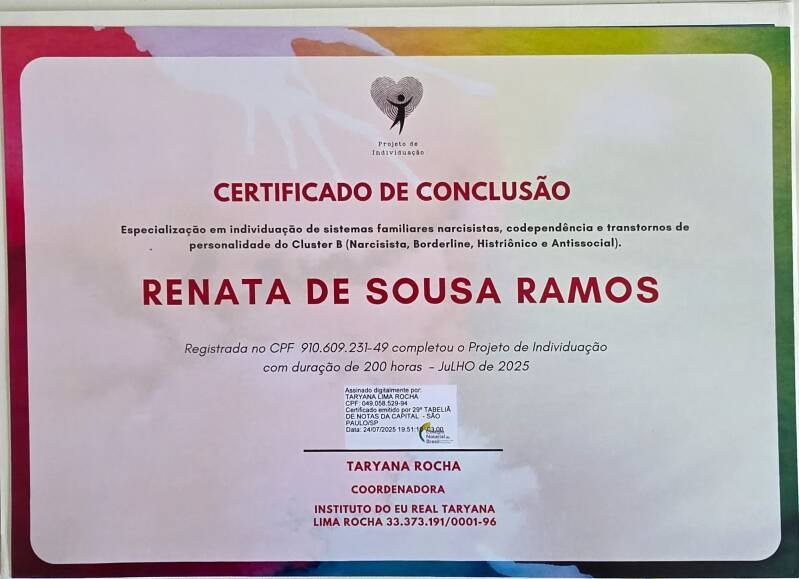 Mijn nieuwsgierigheid bracht me daarna naar Tharyana Rocha, een van de meest gerespecteerde therapeuten in Brazilië, gespecialiseerd in Narcisme. Daar verdiepte ik mij verder in "Narcistische Gezinssystemen", wat mijn specialisatie werd.