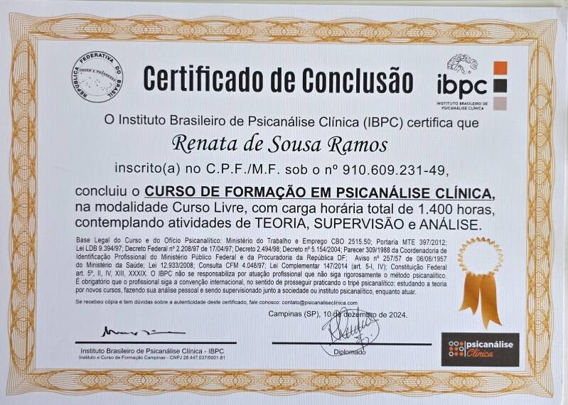 Vervolgens vervolgde ik mijn studies in "Psychoanalyse" aan de prestigieuze Braziliaanse instelling "Klinische Psychoanalyse", waar ik mijn diploma behaalde en Psychoanalyticus werd.