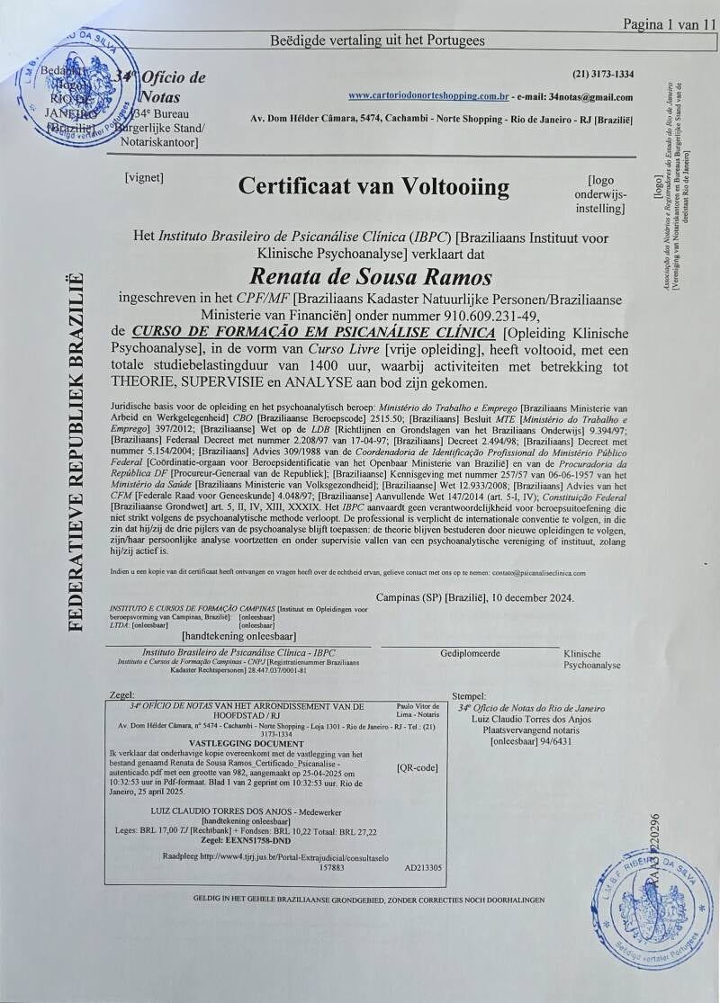 Aangename, mijn naam is Renata Ramos, ik ben 49 jaar oud en kom uit Brazilië. Al 11 jaar woon ik in Nederland, waar ik de afgelopen 6 jaar met veel passie en toewijding de studie Psychoanalyse gevolgd.